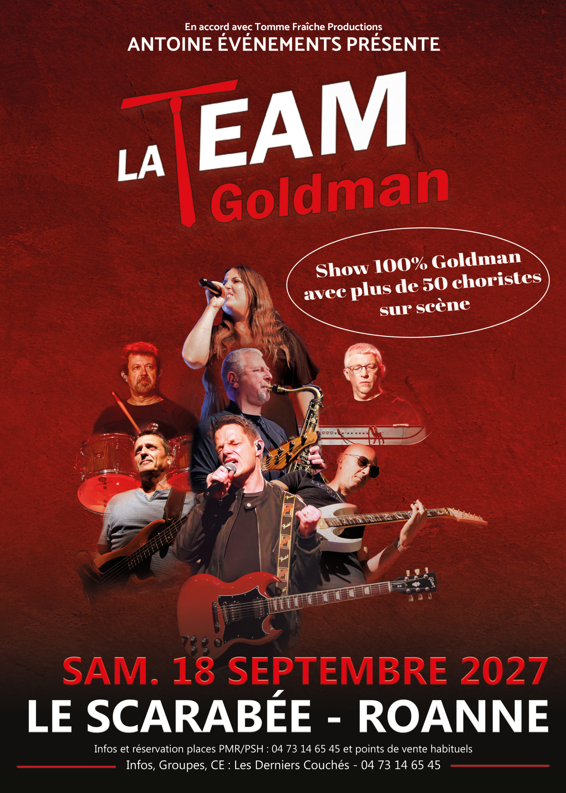 Pour des raisons indépendantes de notre volonté et de celle des artistes, la date de LA TEAM GOLDMAN initialement prévue le 25 Avril 2026 à 20h au Scarabée à Roanne est reportée au Samedi 18 Septembre 2027 à 20h.